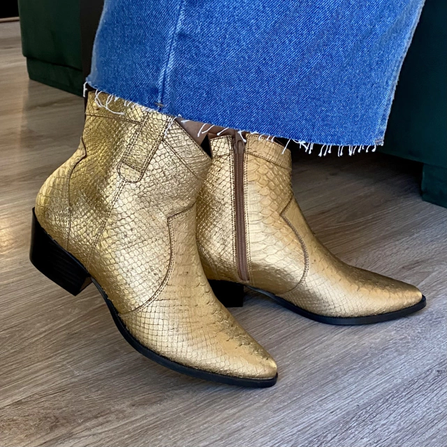 Bota em couro Croco dourado com fechamento em zíper. Salto: 4,5 cm Material: couro metalizado ouro